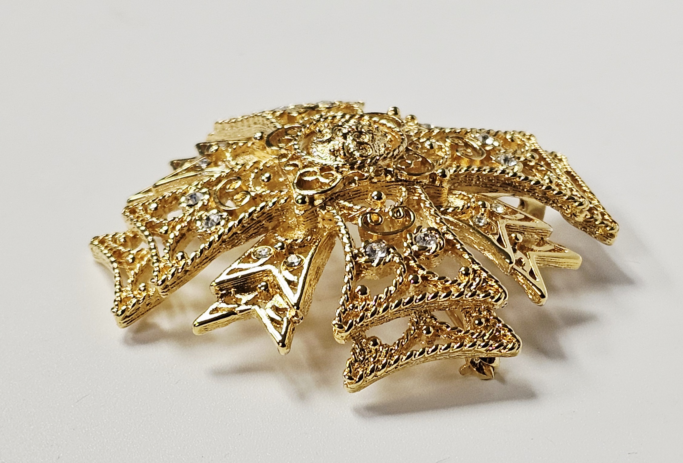The brooch is in excellent condition with all rhinestones present and securely set. The gold-toned finish remains bright and consistent with no significant wear or oxidation visible. The pin mechanism and safety clasp are in good working order.