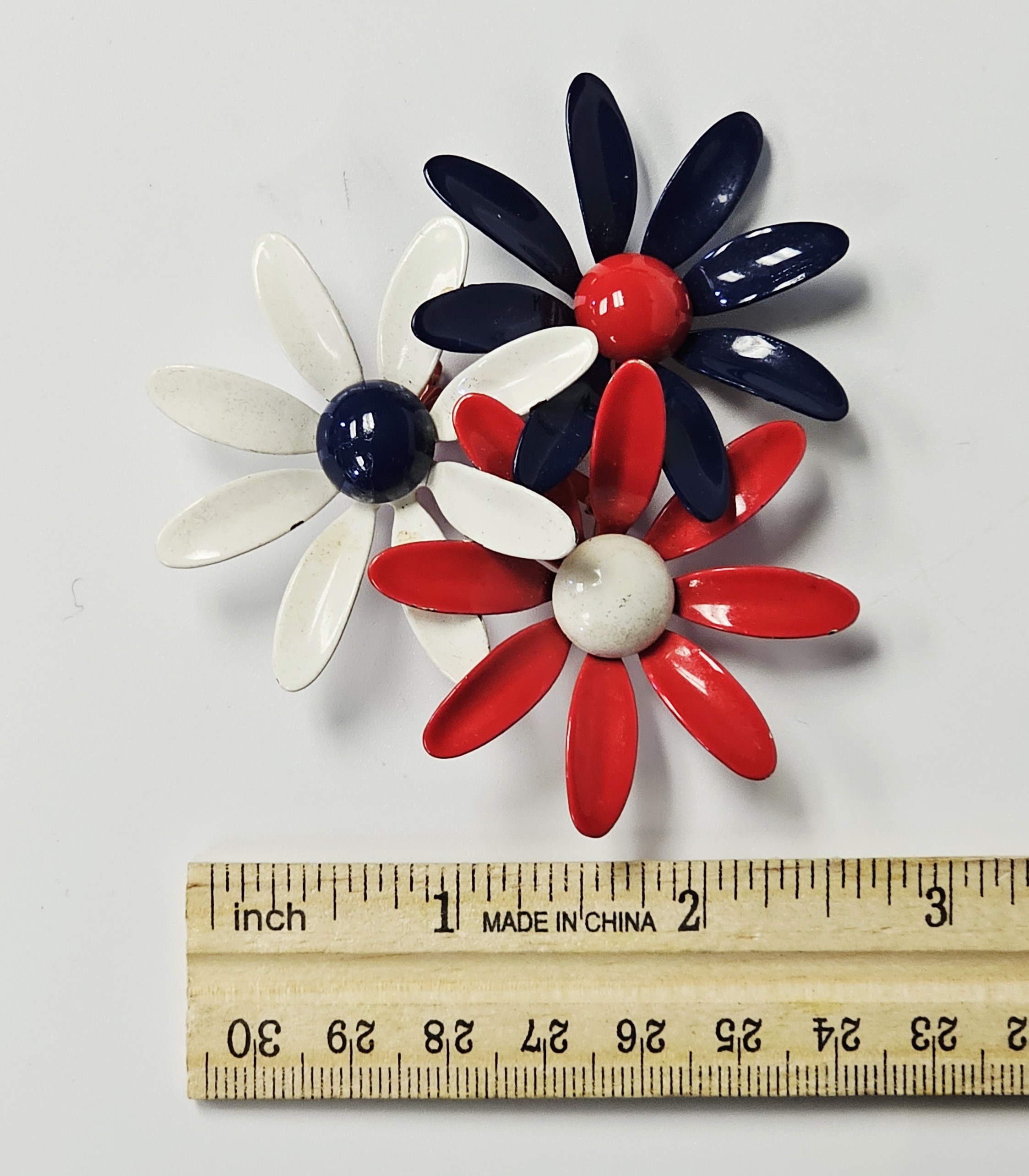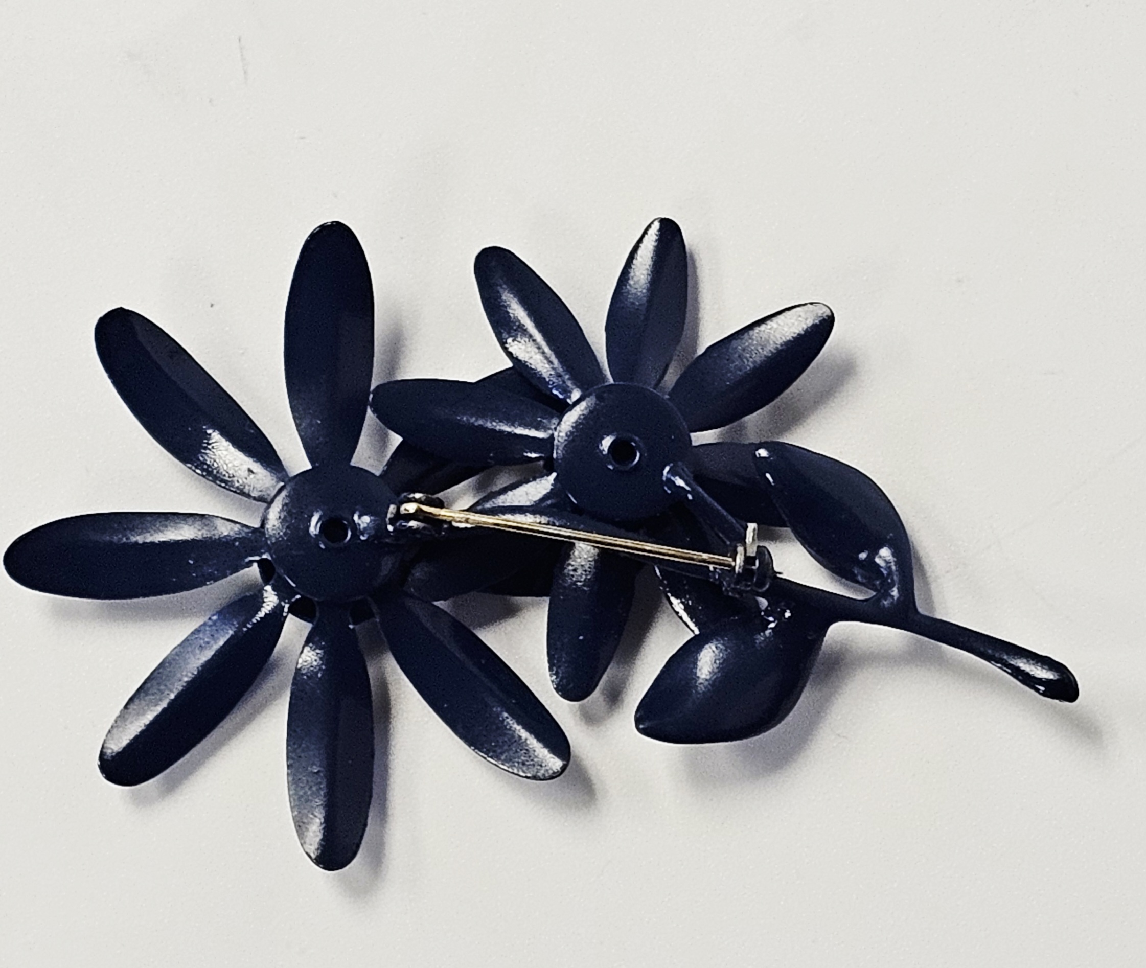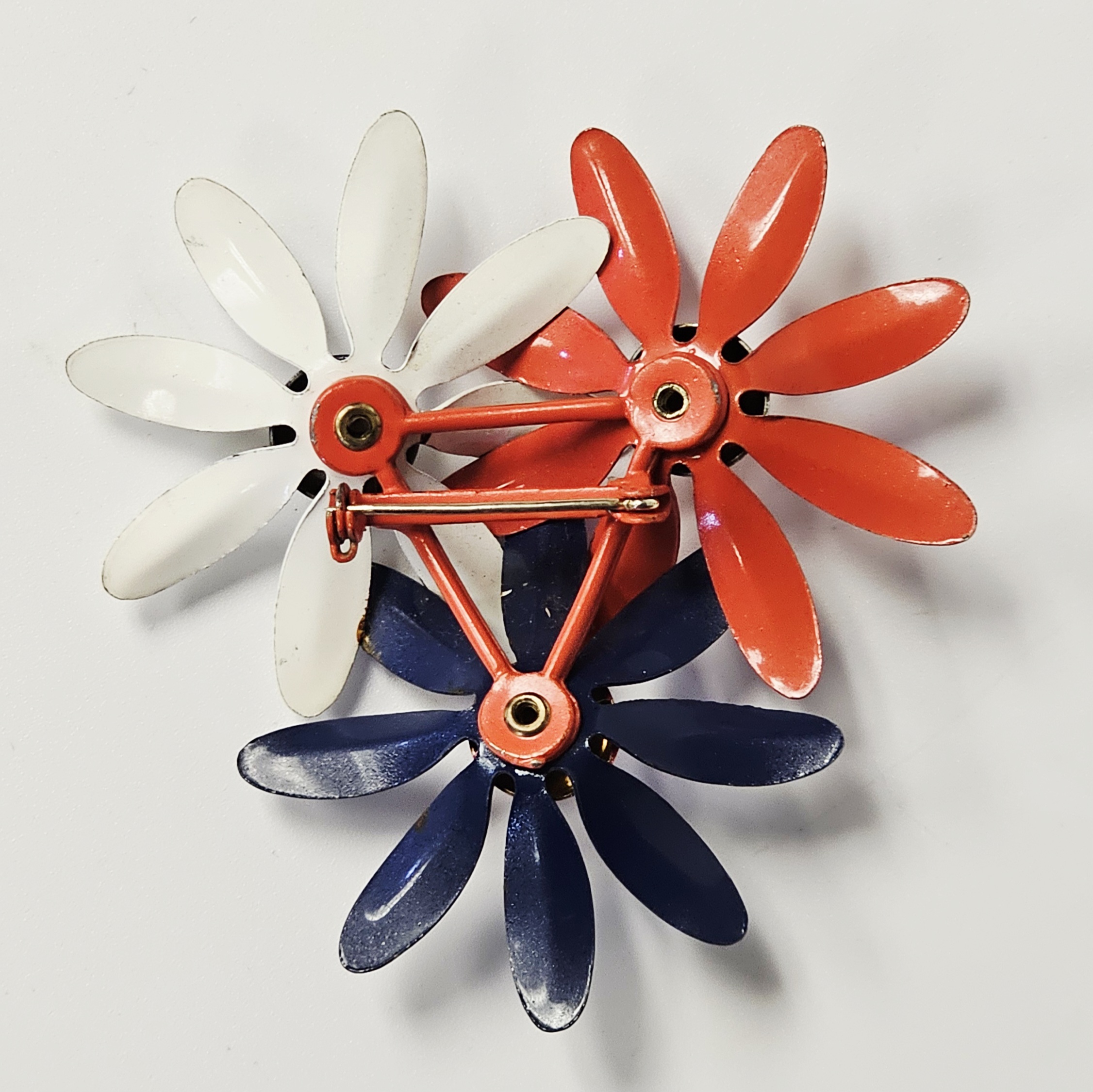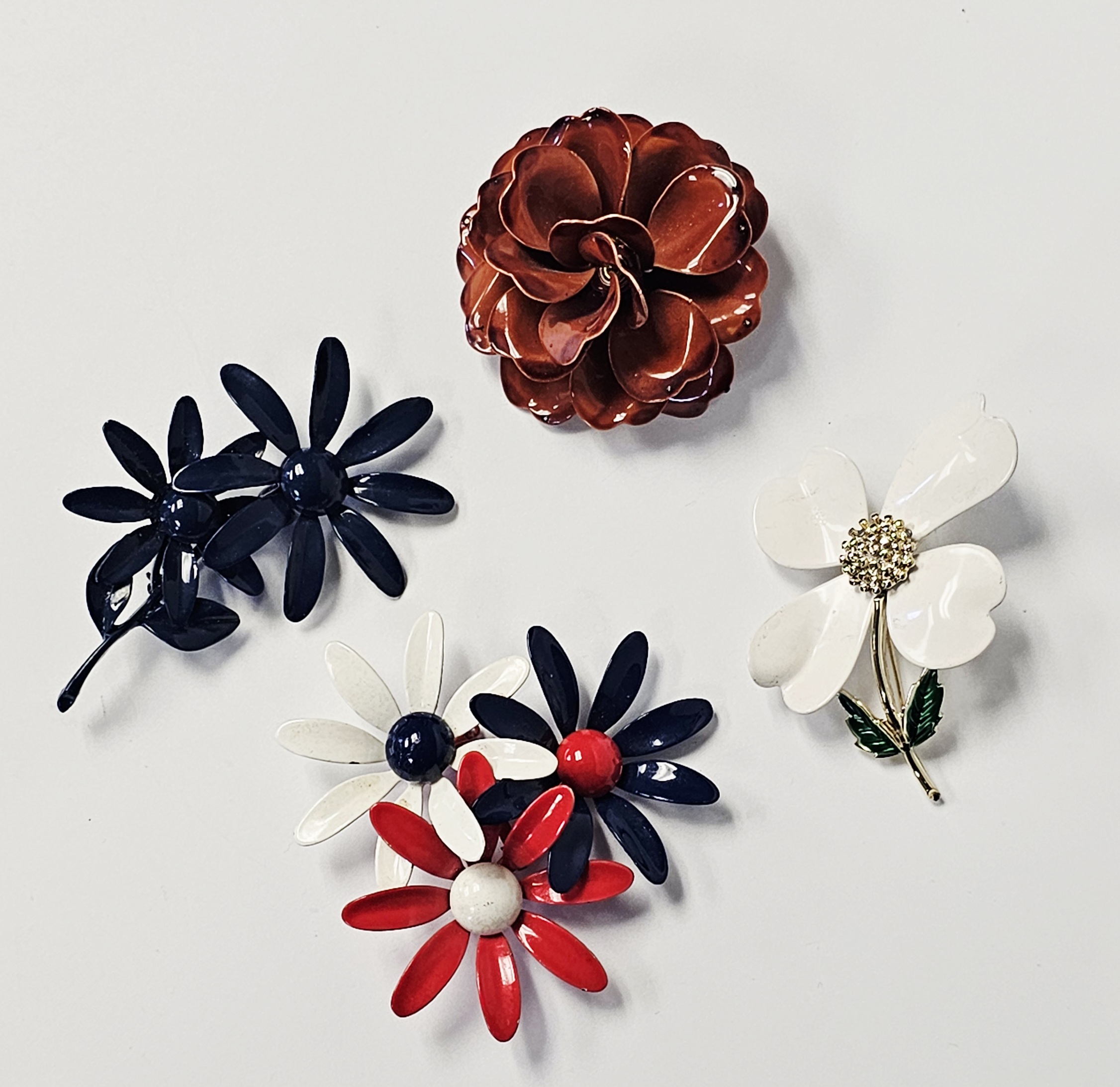 This collection features several mid-century style costume jewelry brooches with various floral motifs and enamel finishes on base metal. The assortment includes a blue enameled double daisy brooch on a common stem with leaves, a triple daisy cluster brooch enameled in red, white, and blue with contrasting centers, a three-dimensional multi-petal flower brooch in glossy chocolate-brown enamel, and a dogwood blossom brooch with white enameled petals and green enameled leaves on a gold-tone stem. All items are equipped with safety clasp pin mechanisms. No maker marks, signatures, or hallmarks are visible on the reverse of any item. Blue flower brooch: 2.75 inches long Triple flower brooch: 2.5 inches wide Brown flower brooch: 2 inches in diameter DoThe collection is in good to fair vintage condition. The blue double flower brooch and the brown multi-petal brooch show minor surface wear to the enamel. The red, white, and blue triple flower brooch exhibits minor enamel chipping on the petal edges. The white dogwood blossom brooch shows several surface scuffs and minor discoloration on the petals.gwood brooch: 2.5 inches wide.