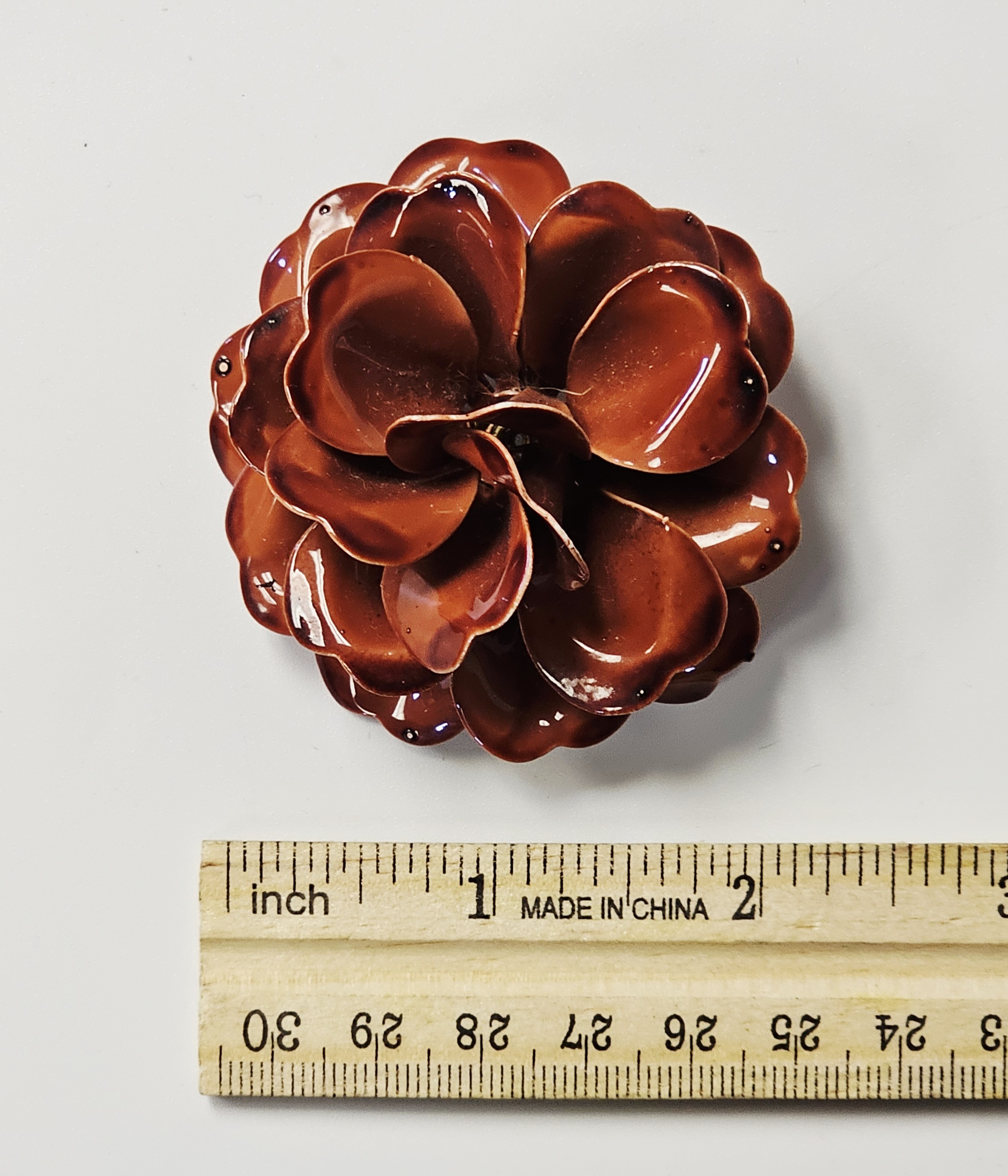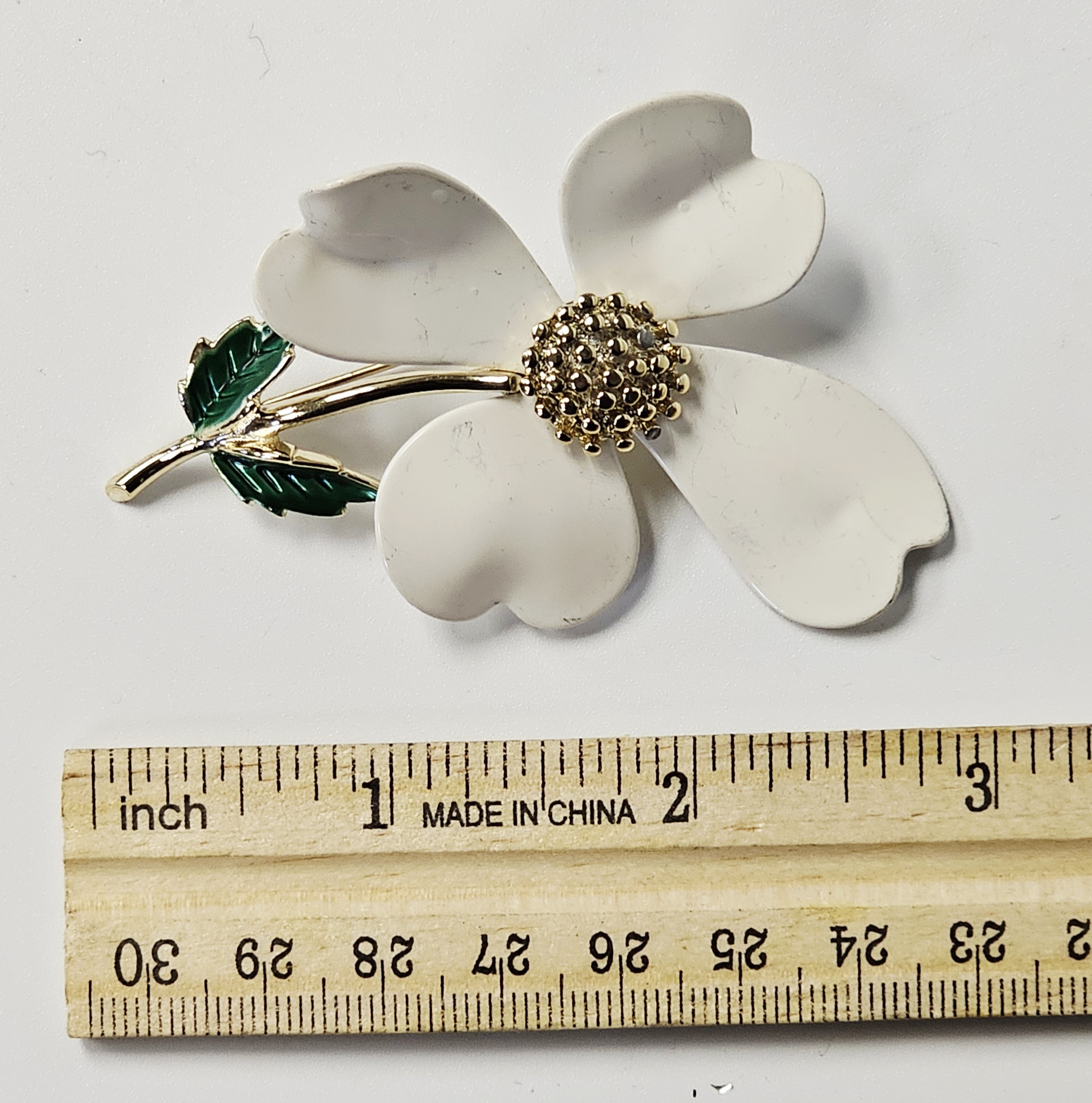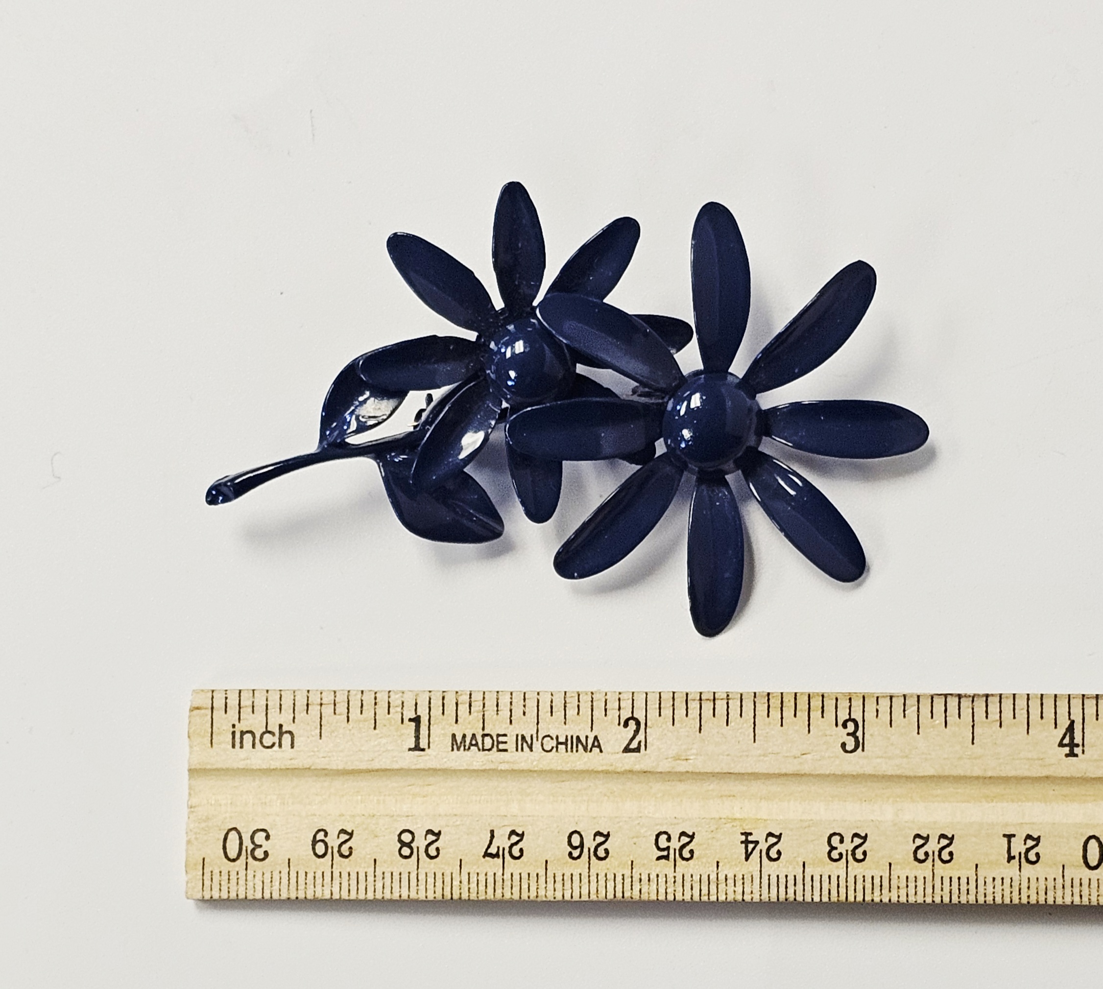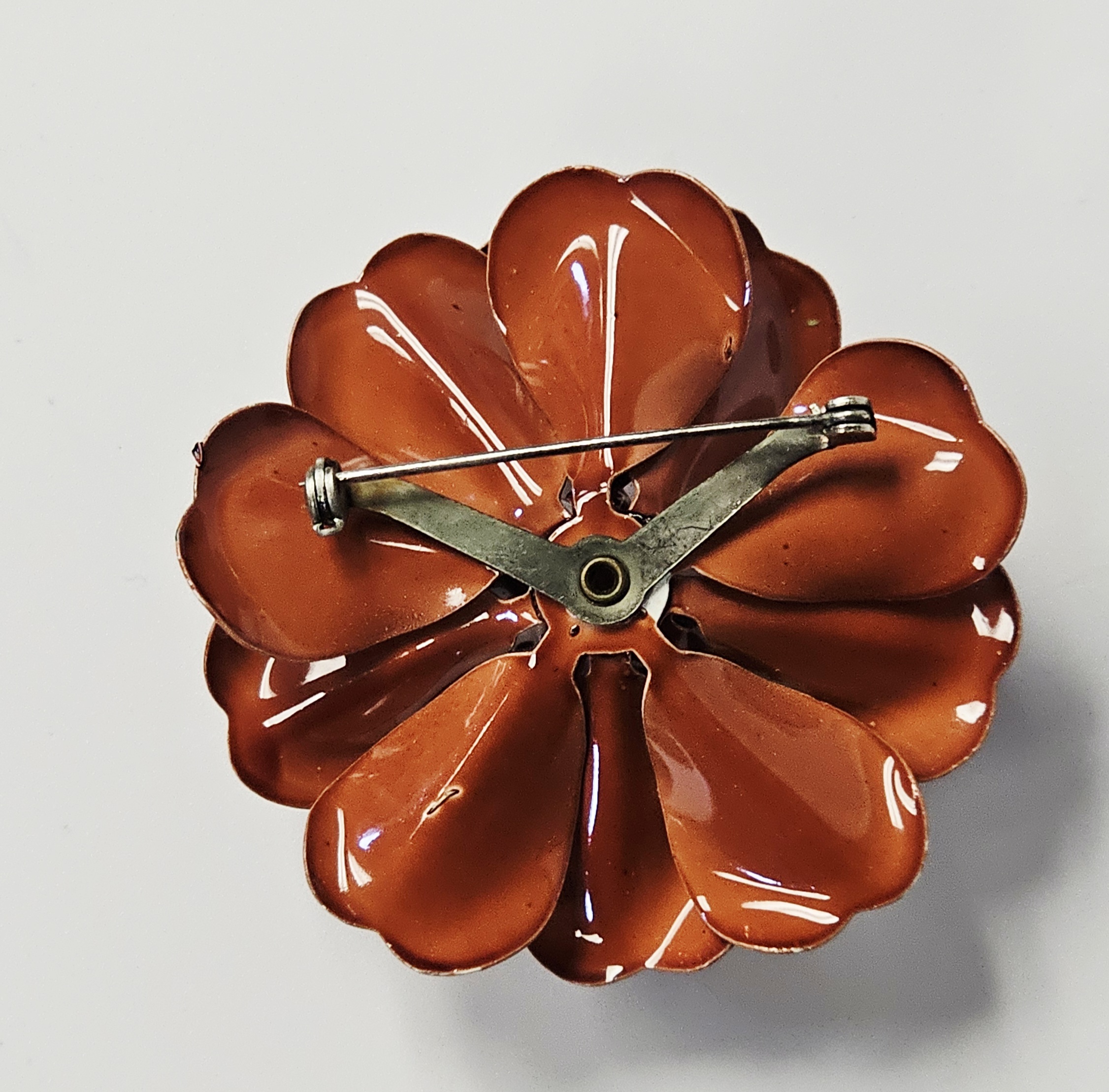 This collection features several mid-century style costume jewelry brooches with various floral motifs and enamel finishes on base metal. The assortment includes a blue enameled double daisy brooch on a common stem with leaves, a triple daisy cluster brooch enameled in red, white, and blue with contrasting centers, a three-dimensional multi-petal flower brooch in glossy chocolate-brown enamel, and a dogwood blossom brooch with white enameled petals and green enameled leaves on a gold-tone stem. All items are equipped with safety clasp pin mechanisms. No maker marks, signatures, or hallmarks are visible on the reverse of any item. Blue flower brooch: 2.75 inches long Triple flower brooch: 2.5 inches wide Brown flower brooch: 2 inches in diameter DoThe collection is in good to fair vintage condition. The blue double flower brooch and the brown multi-petal brooch show minor surface wear to the enamel. The red, white, and blue triple flower brooch exhibits minor enamel chipping on the petal edges. The white dogwood blossom brooch shows several surface scuffs and minor discoloration on the petals.gwood brooch: 2.5 inches wide.